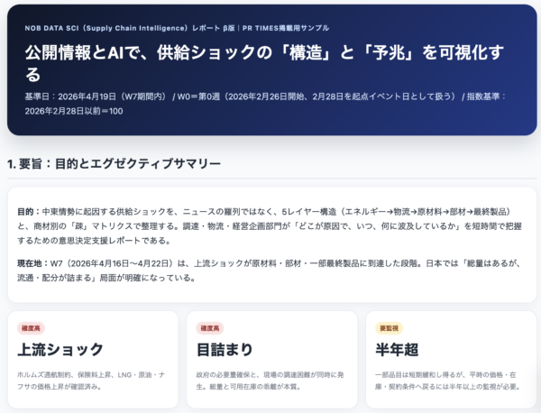 NOB DATA株式会社は、公開情報とAIを活用して、日本およびグローバルの物流状況を把握・整理する「NOB DATA SCI(Supply Chain Intelligence)レポート(β版)」の提供を開始しました。